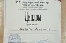 Ученица 4 класса Герасева Тоня и ученица 5 класса Рыдаева Настя 15.04.2019 г. приняли активное участие в IX Международном конкурсе чтецов им. Г.Тукая и были награждены дипломами. Администрация школы выражает благодарность за подготовку конкурсантов учителям родного языка и литературы Булатовой Л.А. и Валиевой Л.Н.