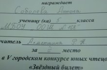 Поздравляем ученика 5 класса МБОУ «ООШ № 168» Соболева Антона, занявшего 3 место в городском конкурсе чтецов «Звездный билет». Выражаем благодарность учителю русского языка и литературы Ахметшиной Р.Н. за подготовку призера!