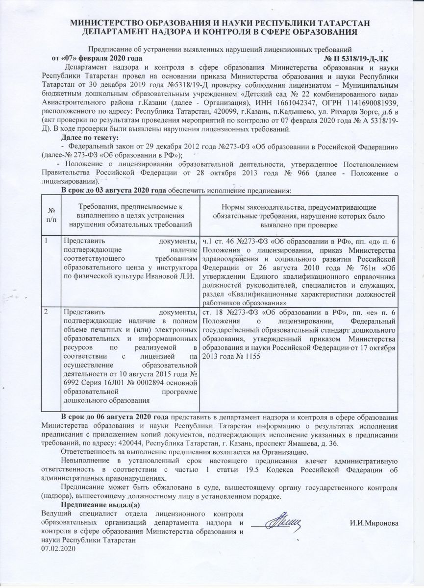 Предписание об устранении нарушений в области образования МБДОУ «Детский сад №22» 2020 г