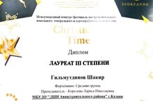 25 декабря 2023г. состоялся Международный конкурс-фестиваль инструментального, вокального, театрального и хореографического искусства "Christmas time". Ученик фортепианного отдела преподавателя Королевой Л.Н. Гильмутдинов Шакир принял участие в конкурсе. В номинации "Фортепиано" соло Шакир стал Лауреатом 3 степени!