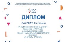 Учащиеся школы приняли участие в Республиканском конкурсе детского творчества "100/лица" реализуемого под эгидой "Казань-музыкальный город ЮНЕСКО" в номинации "Учитель-ученик", заняли хорошие места. Поздравляем! Молодцы! Дальнейших успехов!