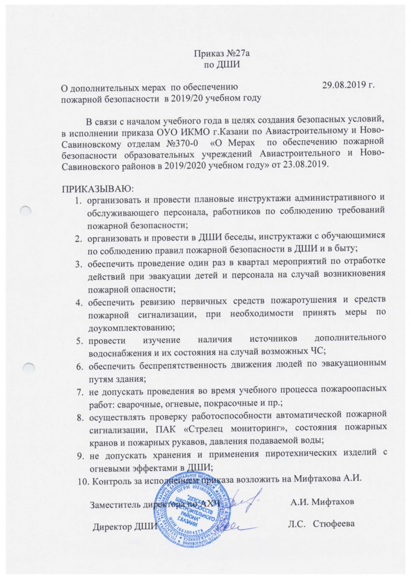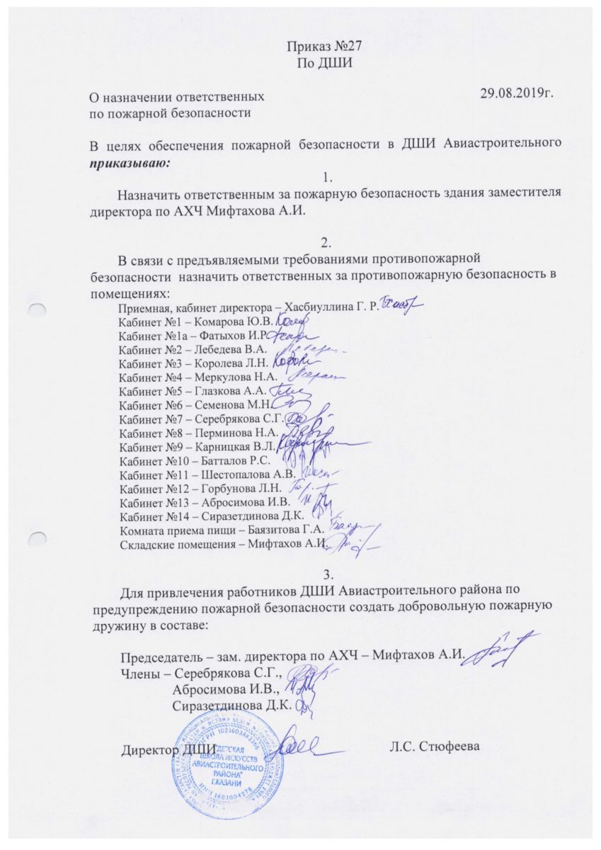 Приказ №27 от 29.08.2019 "О назначении ответственных по пожарной безопасности"