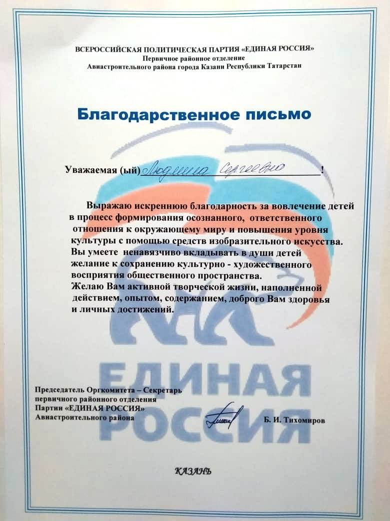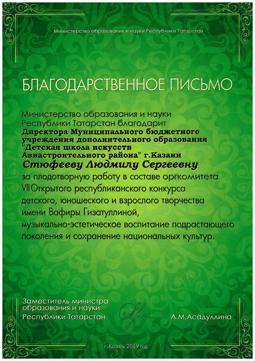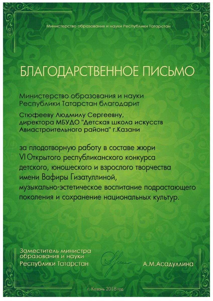 VII Открытый республиканский конкурс детского, юношевского и взрослого творчества имени Вафиры Гизатуллиной, Благодарственное письмо за работу в жюри.