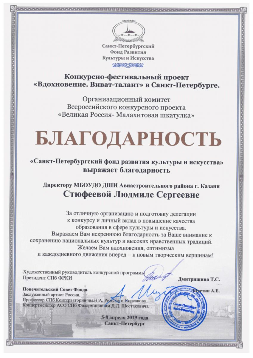 1. Конкурсно-фестивальный проект "Вдохновение.Виват-талант" в Санкт-Петербурге, Благодарность.