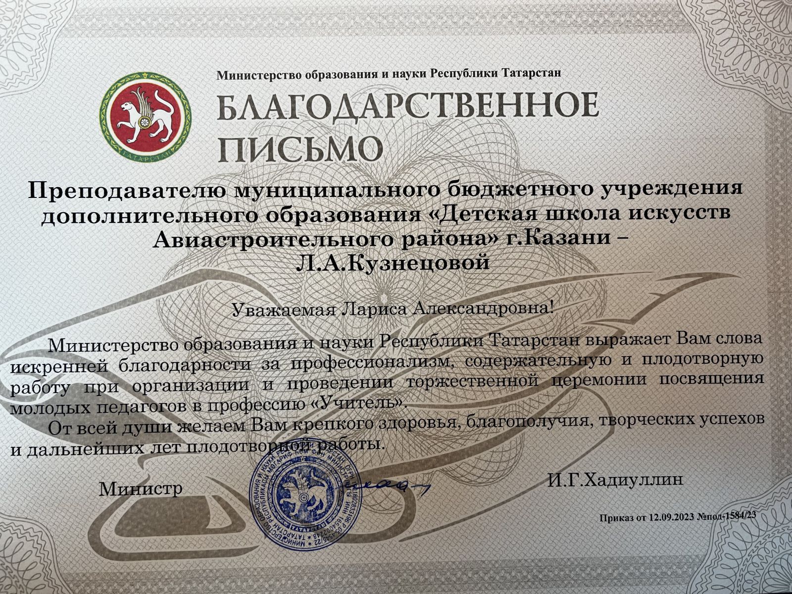 2. Участие в организации и проведении торжественной церемонии посвящения молодых педагогов в профессию "Учитель" Кузнецова Л.А.;