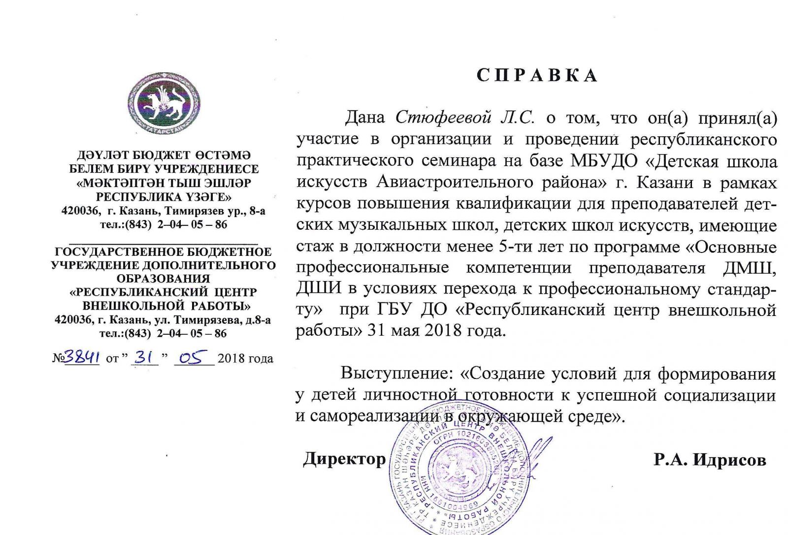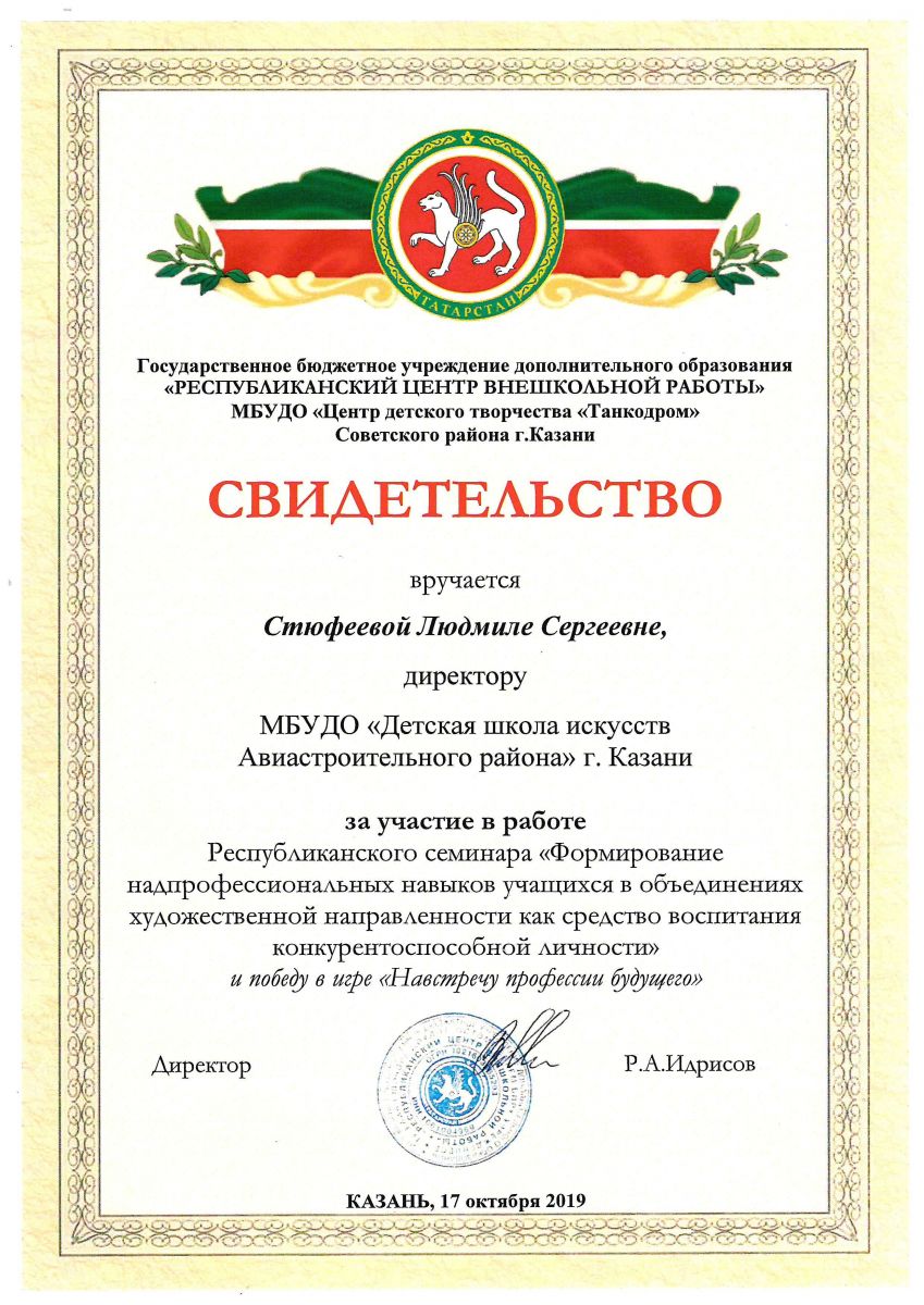 2. Участие в районном семинаре-практикуме руководителей, заведующих отделами, педагогов доп.образования всех направленнностей, методистов, педагогов-организаторов по теме: "Современные образовательные технологии в условиях внедрения Целевой модели развития региональных систем ДОД: опыт ЦВР Авиастроительного района г.Казани, Сертификат Стюфеева Л.С.
