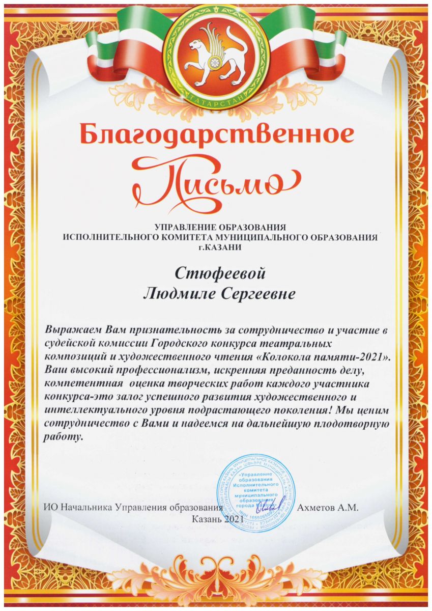 8. Городской конкурс театральных и художественного чтения "Колокола памяти-2021", Благодарственное письмо