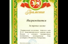 Сегодня коллективу детского сада вручили грамоту за 3 место в районном конкурсе театральных постановок, посвященному Году культуры в Республике Татарстан. Поздравляем коллектив с победой!