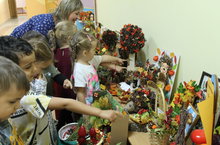 В преддверии праздника "Дня дошкольного работника" педагоги совместно с родителями организовывают выставку из даров осени. Каждый год осенняя выставка проходит маштабно, занимает весь холл второго этажа детского сада. Участниками выставки становится каждая семья - утверждаю, что КАЖДАЯ. Стоит только нескольким поделкам из групповых помещений плавно пересилиться в холл, как каждый ребенок (который еще не принес поделку), проходя каждое утро и каждый вечер с родителями мимо этой красоты, мимо необыкновенных и чудных "произведений искусств", на следующий день приносит продукт своего творчества. Воспитатели организовывают экскурсии по выставке, а дети рассказывают и с гордостью показывают какую поделку они сделали с родителями. Выставка проходит с 23 по 30 сентября.