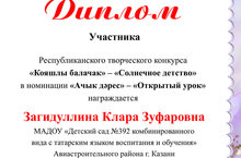 В Республиканском творческом конкурсе "Кояшлы балачак" - "Солнечное детство" в номинации "Ачык дәрес" - "Открытый урок" награждается дипломом воспитатель по обучению татарскому языку Загидуллина Клара Зуфаровна. Поздравляем.