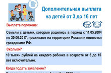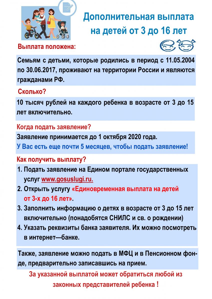 С 1 июня 2020 разовую выплату 10000 рублей на детей с 3 до 16 лет получат все семьи в России. Владимир Путин подписал соответствующий указ от 11 мая 2020 года № 317. Каждая российская семья с детьми от трех лет и до наступления 16-летнего возраста, может подать заявление на получение единовременной выплаты в 10000 руб. Подать заявление можно с 12 мая 2020 года. Обратиться за выплатой можно дистанционно с помощью портала «Госуслуги» или через отделение Пенсионного фонда. Этого достаточно, чтобы получить 10000 рублей на каждого ребёнка начиная с 1 июня 2020 года.