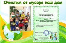 Воспитатель нашего Детского сада Бикмухаметова Лилия Рафиковна стала дипломантом Всероссийской природоохранной акции «Очистим от мусора наш дом» с творческой работой из бросового материала «Спасём планету от мусора». В настоящее время очень остро стоят серьёзные проблемы окружающей среды и поиск способов их разрешения. Одна из целей экологического воспитания - формирование начал экологической культуры, в том числе правильного отношения к природе, к себе и другим людям как к части природы, к вещам и материалам природного происхождения. Чтобы ребёнок научился понимать природу, чувствовать её красоту, читать её язык, беречь её богатства, нужно прививать ему эти чувства с самого раннего детства, когда интерес к окружающему миру велик.