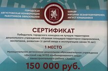 Поздравляем коллектив нашего детского сада, а также наших родителей и воспитанников с победой (I место) в конкурсе на лучшую территоррию дошкольного учреждения "Игровая площадка оздоровления, воспитания, развития" (с датой ввода в эксплуатацию более 15 лет).