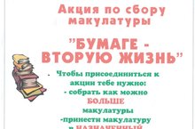 Дорогие дети и уважаемые родители! Приглашаем вас принять участие в экологической акции “Бумаге-вторую жизнь!” Акция прийдет 18 по 23 ноября. Вы можете сдать газеты, старые книги, журналы, картон, использованную белую бумагу. По итогам будет определена самая активная группа! А самых активных участников ждут грамоты и подарки!