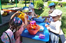 Сегодня в детском саду прошел воздушно-морской праздник. Дети с удовольствием принимали участие в соревнованиях "Кто быстрее наберет воды?", "Пронеси и не пролей!" , "Не урони водяную бомбу!".