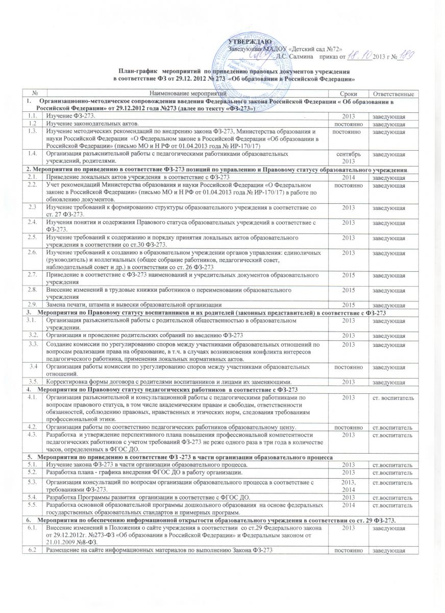 План-график мероприятий по приведению правовых документов учреждения в соответствии с ФЗ от 29.12.2012 г. №273 "Об образовании"