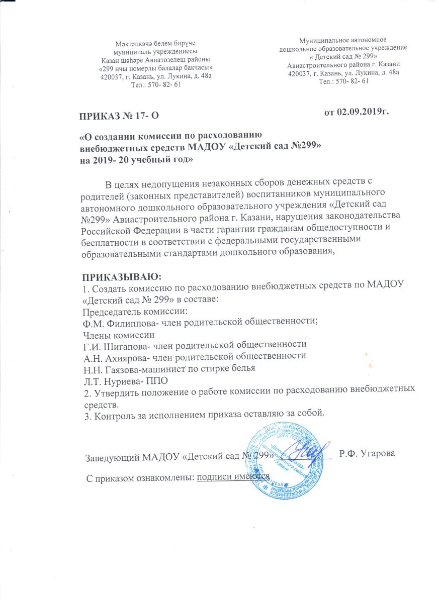 Приказ по МАДОУ № 299 о создании комиссии по расходованию внебюджетных средств