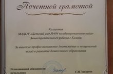 По итогам 2019 года, всероссийского конкурса " Лучший детский сад России-2019!", коллектив нашего детского сада награжден Почетной грамотой Управления Образования города Казани за высокие профессиональные достижения и неоценимый вклад в развитие дошкольного образования! Много творческих идей мы воплотили в жизнь, но многое еще предстоит сделать, чтобы нашим воспитанникам было комфортно в условиях нашего Теремка!
