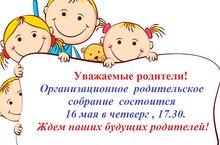 Внимание! Внимание! 16 мая ( четверг) в 17.30. состоится организационное родительское собрание для родителей ( законных представителей) будущих воспитанников. С целью эффективности встречи, убедительная просьба, ограничить присутствие детей на собрании. Согласно предоставленной памятки, не забудьте принести копии документов.