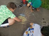 Когда рисуют на асфальте дети!Рисовать цветными мелками, да еще не на бумаге, а на асфальте — это счастье для наших художников. Асфальт расцветал красками, желтое солнце светило неровными лучами, на лугу расцвёл ковёр из разноцветных цветов, рисовали цветы, бабочек, море, природу. Дети очень старались, аккуратно раскрашивая свои рисунки. Никто не скучал, были все заняты творчеством!
