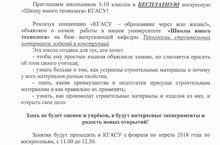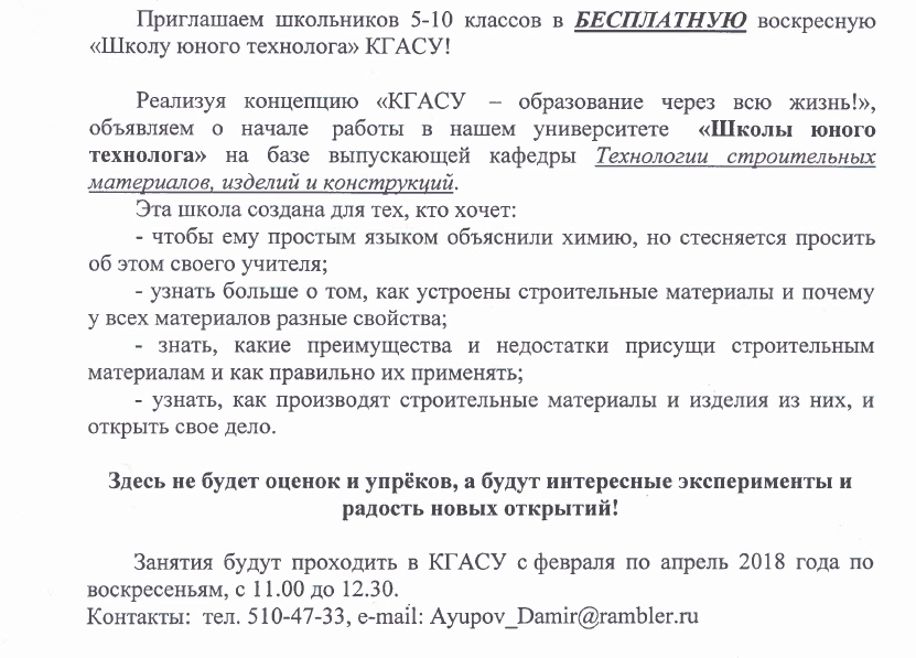 Казанский государственный архитектурно-строительный университет приглашает школьников 5-10 классов в воскресную школу "Школа юного технолога". Занятия проводятся бесплатно
