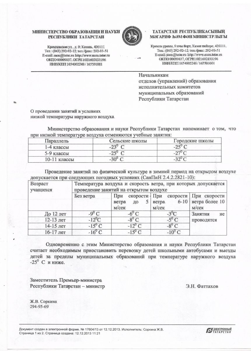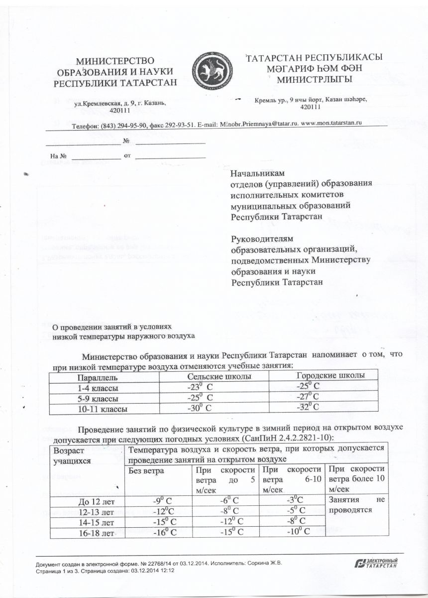 Информация о проведенеии занятий в условиях низкой температуры воздуха