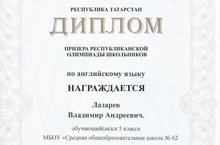 Поздравляем Лазарева Владимира (5 г класс) – призёра заключительного этапа Республиканской олимпиады школьников по английскому языку - и его наставника - учителя английского языка Халирахманову Рамилю Ривкатовну.