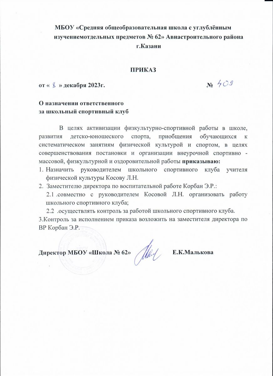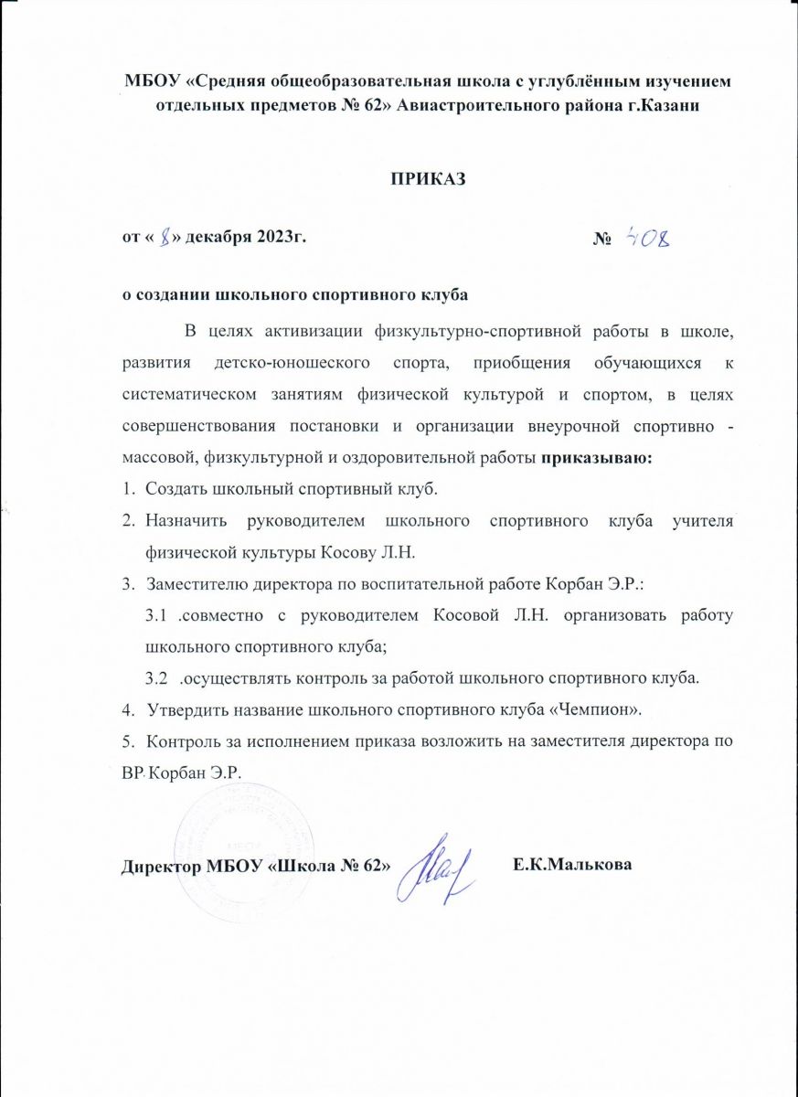 Приказ о создании школьного спортивного клуба