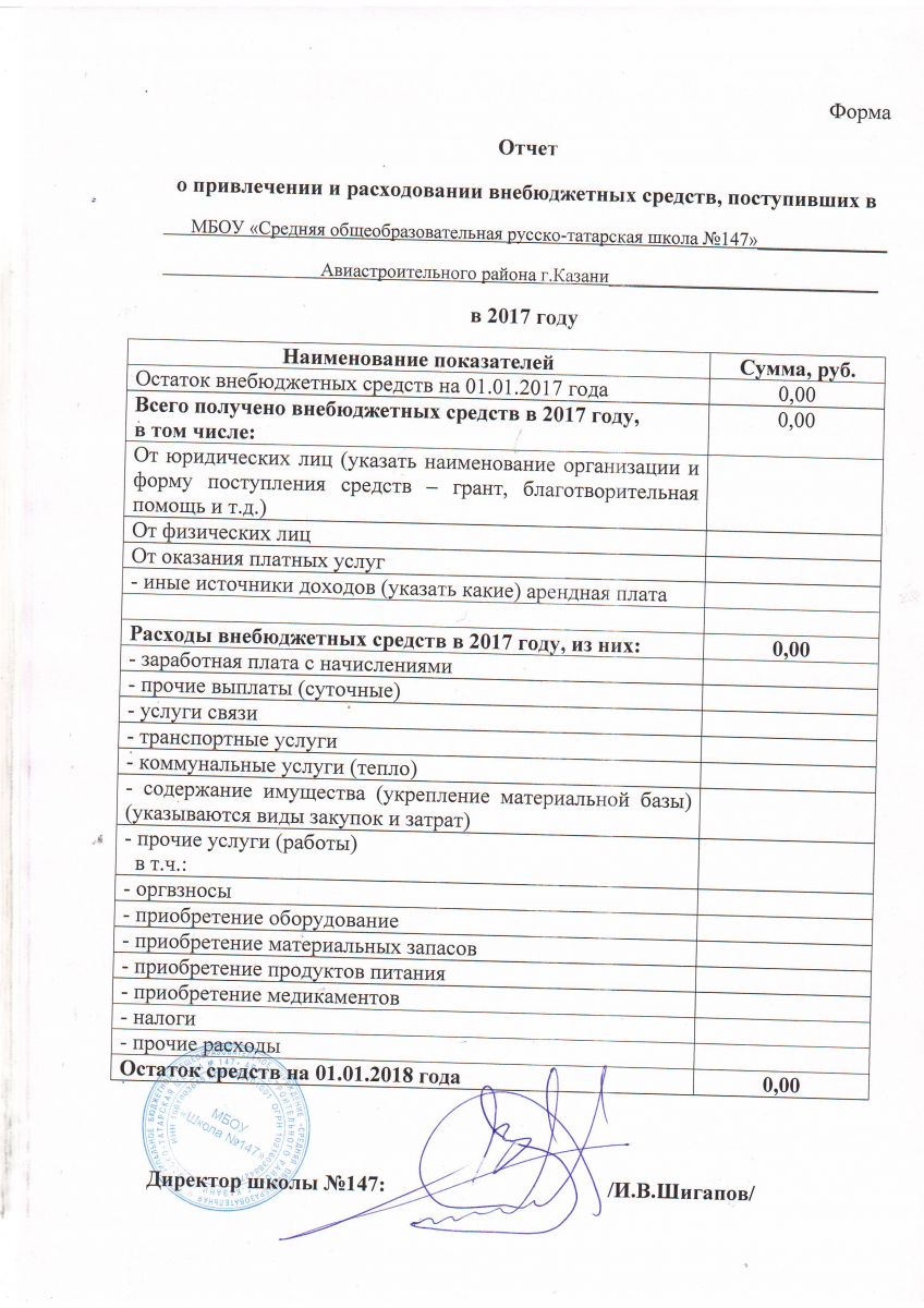 Отчет о привлечении и расходовании внебюджетных средств ,поступивших в ОУ 2017г.