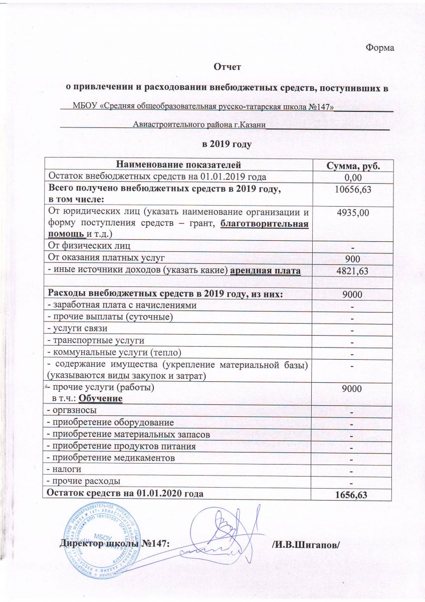 Отчет о привлечении и расходовании внебюджетных средств поступивших в ОУ 2019 г.