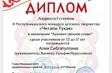 Сибгатуллина Алия, ученица 6 «б» класса нашей школы, стала лауреатом I степени II Республиканского конкурса детского творчества "Читаем Тукая" в номинации «Художественное слово» и награждена дипломом. Поздравляем нашу Алию и руководителя Валиеву Зульфию Нурулловну!