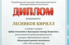 Республиканский культурно-образовательный проект « *Культурный дневник школьника»* начал свой новый, седьмой, год. Этот год предполагает быть необычным, но таким же ярким и полным культурных событий, новых знаний, которые ребята преобретут не только в школе, но и изучая культуру родного Татарстана с помощью культурного дневника школьника. В сентябре первоклашки получили свой первый дневник и принялись активно заполнять и участвовать в конкурсах. Ученики 1В класса Мифтахова Самира и Лесников Кирилл стали победителями республиканского конкурса видеоприглашений в Культурную команду. Ребята получают в подарок художественно-анимационное издание «Шурале» с мультфильмом издание с автографом главного режиссера Объединения «Татармультфильм», обладателя призов российских и международных кинематографических фестивалей Сергея Киатрова. МОЛОДЦЫ!
