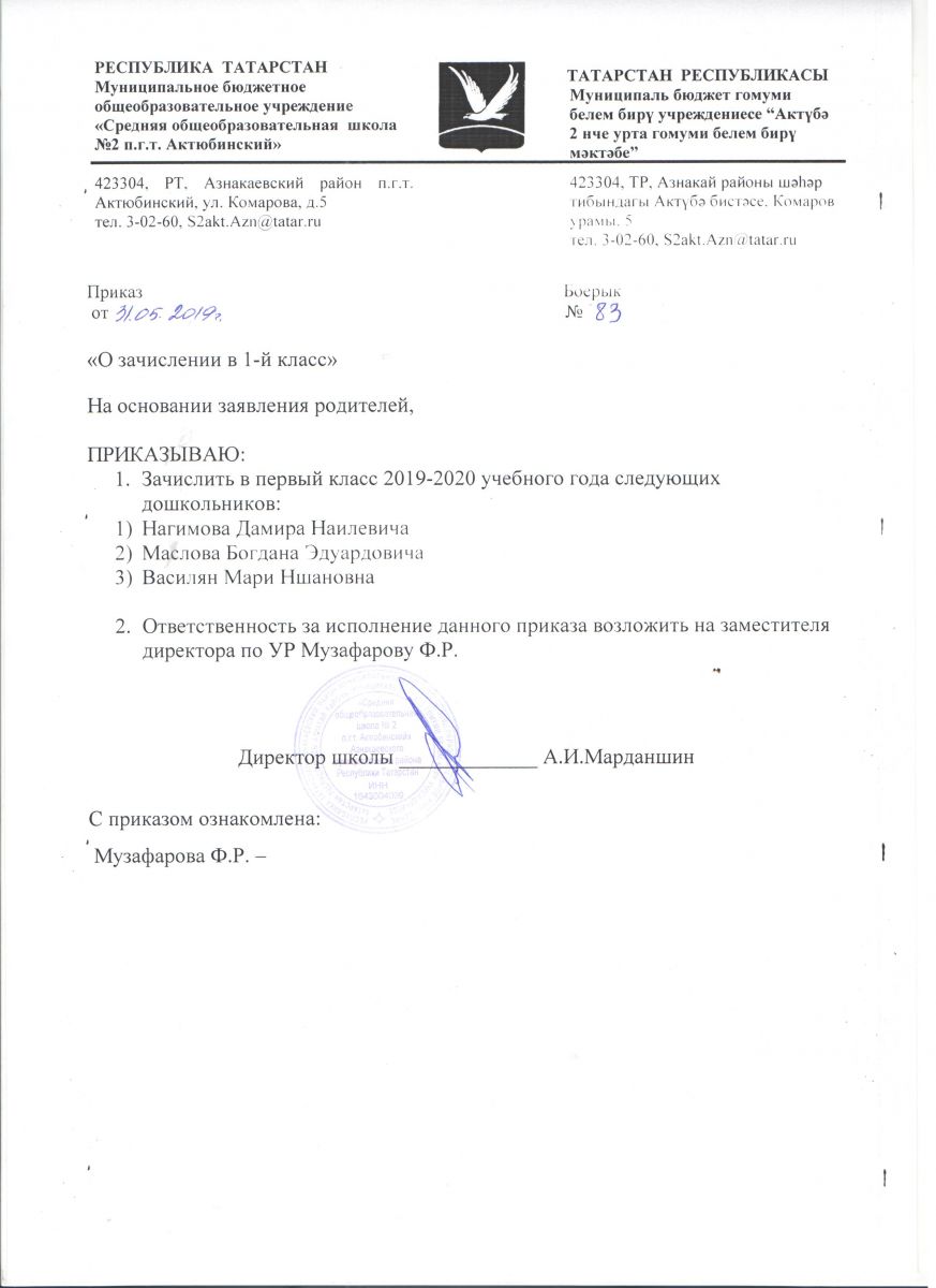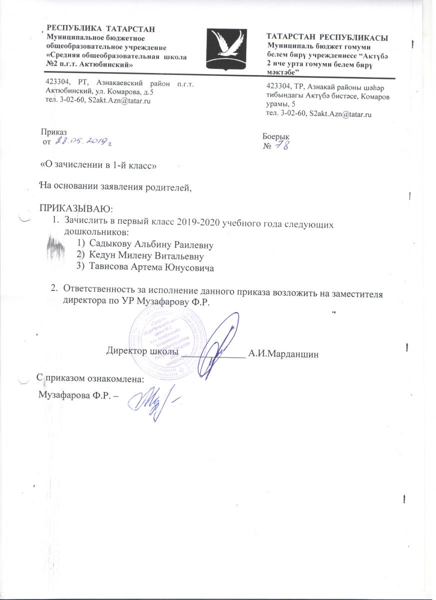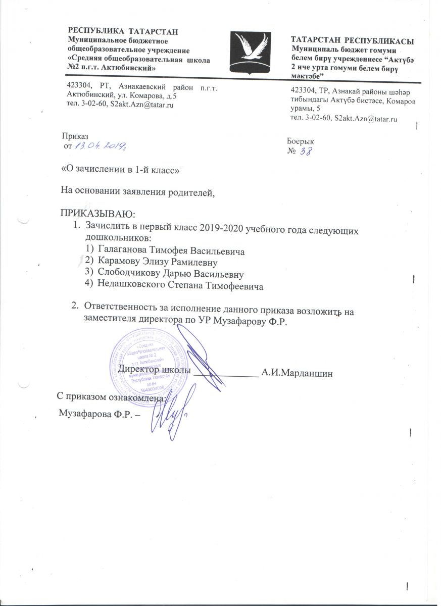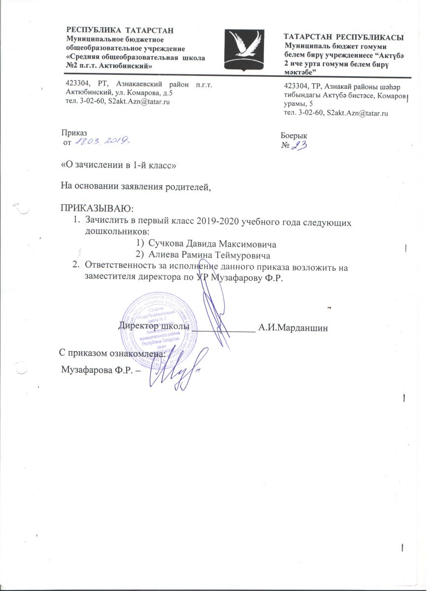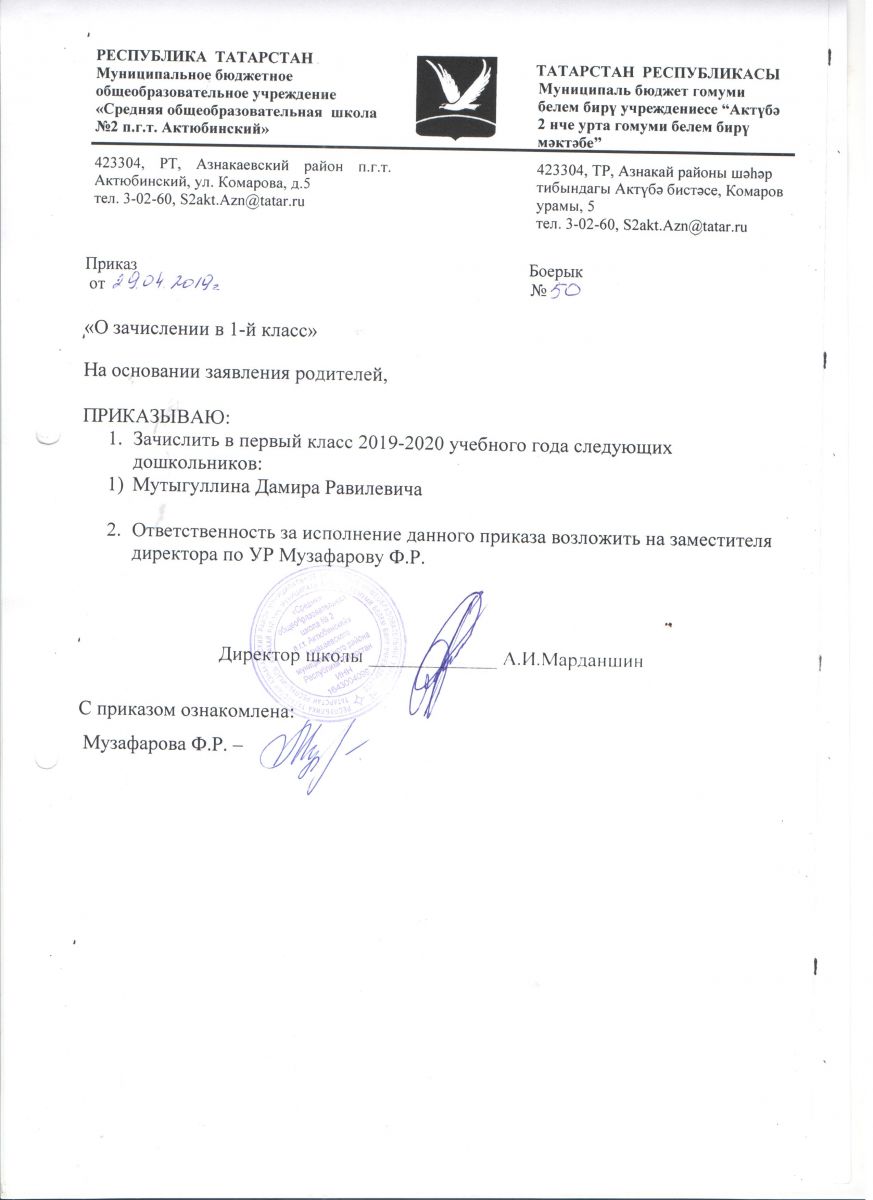 Руководствуясь приказом МОиН РФ от 22.01.2014 №32, "Об утверждении Порядка приёма граждан на обучение по образовательным программам начального общего, основного общего и среднего общего образования", информативным письмом МОиН РФ от 13.12.2016 №08-2715 «О порядке приема в общеобразовательные организации» установлен срок подачи заявления в 1 класс:для детей, проживающих по микрорайону МБОУ "СОШ №2 пгтАктюбинский" Азнакаевского муниципалього рйона РТ с 1 февраля по 30 июня 2019 года; на свободные места с 1 июля 2019 года. Информация о количестве мест в первых классах на 2019/2020 учебный год: 70 мест (3 класса)При себе иметь паспорт, копию свидетельства о рождении ребенка, справку о регистрации ребенка по месту жительства.Хөрмәтле булачак беренче сыйныф укучыларының әти-әниләре!РФ Мәгариф һәм фән министрлыгының 22.01.2014 ел, №32 боерыгы нигезендә, "башлангыч гомуми, төп гомуми һәм урта гомуми белем бирү программалары буенча белем алуга гражданнарны кабул итү тәртибен раслау турында" 13.12.2016 ел, №08-2715 боерыгы нигезендә, «гомуми белем бирү оешмаларына кабул итү тәртибе турында» 13.12.2016 ел, № 08-2715 РФ Мәгариф һәм фән министрлыгы мәгълүмати хаты белән 1 сыйныфка гариза бирү срогы билгеләнде:ТР Азнакай муниципаль районының " Актүбә ш.т.п. 2 нче урта гомуми белем бирү мәктәбе" микрорайоны буенча яшәүче балалар өчен 2019 елның 1 февраленнән 30 июненә кадәр; 2019 елның 1 июленнән ирекле урыннарга.2019/2020 уку елына беренче сыйныфларда урыннар саны турында мәгълүмат: 70 урын (3 сыйныф)Үзең белән паспорт, бала туу турында таныклык күчермәсе, яшәү урыны буенча баланы теркәү турында белешмә булырга тиеш. -