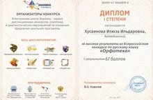 Наши ученики принимают активное участие в конкурсах Электронной школы Знаника по трём дисциплинам школьной программы: математике, русскому языку и информатике. Ученица 9а класса Хусаинова Илюза стала дипломантом 1 степени Конкурса по русскому языку «Орфотека». Это заочный конкурс для школьников, который дает возможность получить интересные, развивающие задания от хороших, профессиональных авторов, проверить свои знания, пополнить свое портфолио новыми достижениями. Садриева Н.Т.