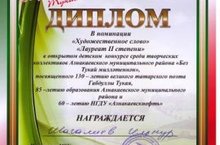 Ученик 7 А класса Шагалиев Ильнур стал «Лауреатом II степени» открытого детского конкурса среди творческих коллективов Азнакаевского муниципального района «Без Тукай милләтеннән», посвященного 130 летию великого татарского поэта Габдуллы Тукая, 85 летию образования Азнакаевского муниципального района, 60 летию НГДУ «Азнакаевскнефть». ПОЗДРАВЛЯЕМ!