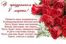Пришла долгожданная пора Весна. И как здорово, что она начинается с праздника, посвященного подругам, женам, матерям, бабушкам. В этот день примите самые искренние пожелания и поздравления. Желаем вам хорошего здоровья, счастья, любви без границы. Будьте счастливы, трижды здоровы и всеми любимы. Администрация и профком школы.