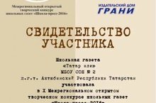 Школьная газета «Татар иле МБОУ « СОШ№2 пгт Актюбинский» участвовала в X Межрегиональном открытом творческом конкурсе школьных газет «Школа – пресс – 2016». В «Школе – пресс – 2016» приняли участие около 200 школьных газет из 10 регионов Приволжского федерального округа, а также других уголков страны.Школьная газета награждена Свидетельством участника. Поздравляем участников конкурса Кашаповой Ф.А. и Кашаповой Ф.И. и желаем им дальнейших творческих успехов и профессиональных высот!