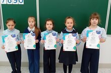 Учащиеся 1 А класса : Юсупова Ралина, Жидебаева Милана, Шепталова Элина, Шаймиева Эмилия - Победители и Афанасьева Ульяна - Призёр Республиканской олимпиады по математике "Эверест".