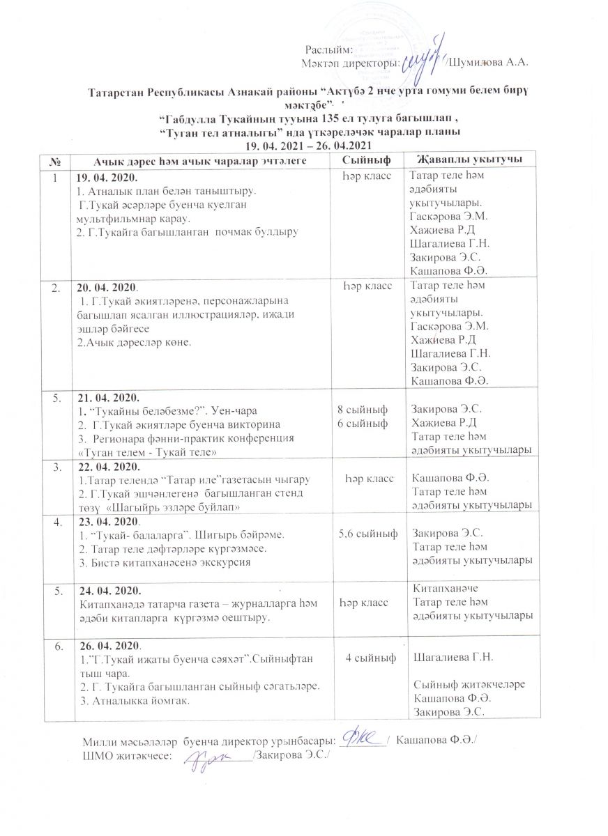 Мәктәптә 19апрельдән 26апрельгә кадәр туган тел атналыгы үтәчәк. “Г.Тукайның тууына 135 ел тулуга багышлап , “Туган тел атналыгы” нда үткәреләчәк чаралар планы.