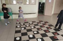 В школе организована объёмная игра в шашки.