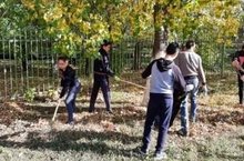 Учащиеся школы убирали школьную территорию от сухиз листьев.
