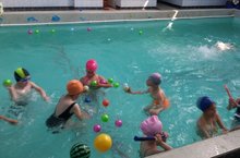 Учащиеся пришкольного лагеря резвятся в бассейне.