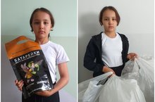 Ученица 3 класса Хуснутдинова Ралина принимает участие в экологической акции по сбору отработанных батареек и пластиковых бутылок.