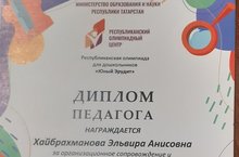 Педагоги Хайбрахманова Э.А., Шакирова Л.А. награждены Дипломами, за организационное сопровождение и подготовку обучающихся к республиканской олимпиаде для дошкольников "Юный Эрудит". Егоров Арыслан - Диплом 1 степени; Кузеванова Сабина - Диплом 2 степени; Едутов Максим - Диплом 3 степени.