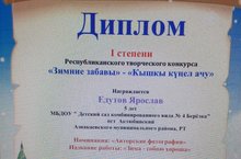 Юлдутов Ярослав «Кышкы күңел ачу» Республика иҗади конкурсының I дәрәҗә Дипломы белән бүләкләнде. Номинация: "Автор фотографиясе". Эшнең исеме « "Кыш яхшы"» Тәрбияче: Хакова Роза Әсхәт кызы