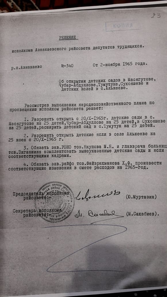 Решение исполкома Азнакаевского райсовета депутатов об открытие детских садов.