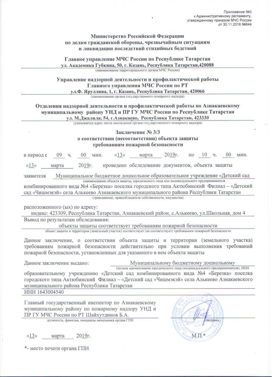 Заключение МЧС о пожарной безопасности объекта МБДОУ д/с "Чищмэкэй" с. Алькеево