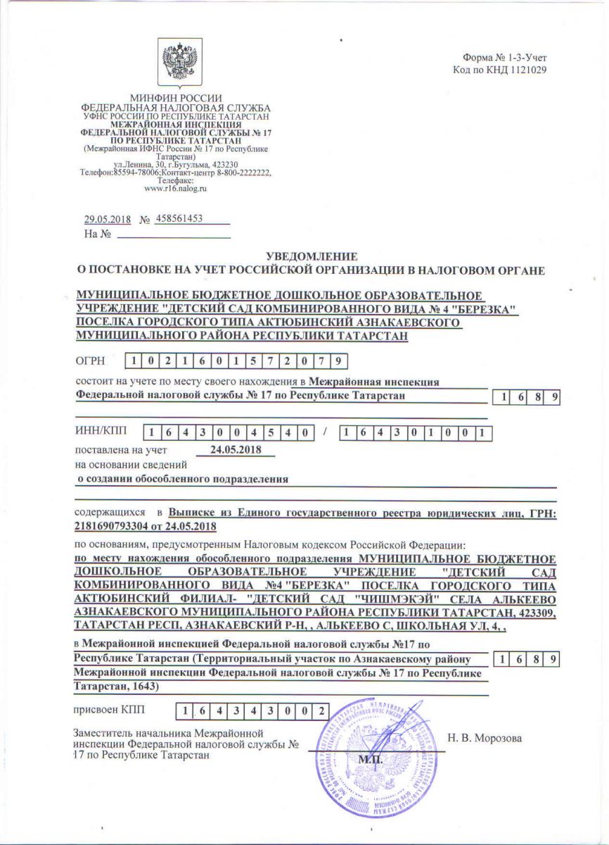 Уведомление о постановке на учет Российской организации в налоговом органе с. Алькеево.
