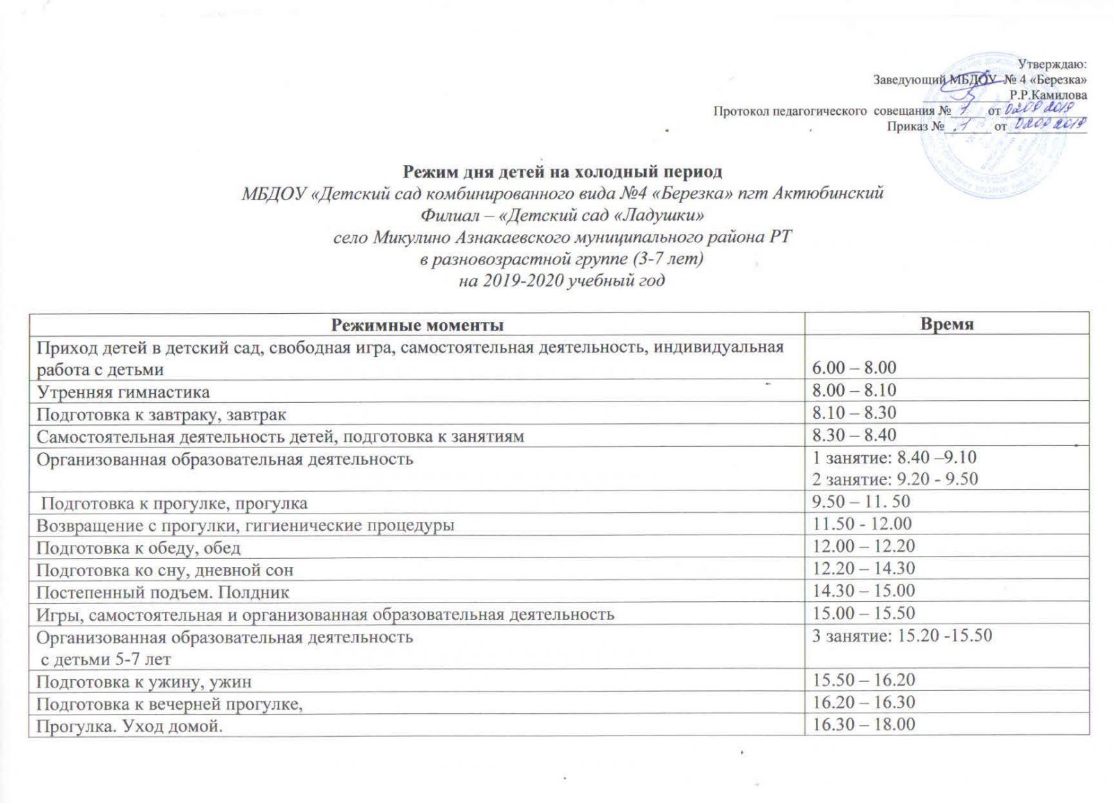 Режим дня на 2020-2021 учебный год с. Микулино.