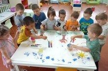 Сегодня во второй младшей группе «Смешарики» закончился краткосрочный проект «Разноцветные ладошки», целью которого являлось развитие художественно-творческих способностей детей младшего возраста посредством использования нетрадиционных техник рисования. Маленькие художники с удовольствием рисовали и мятой бумагой, и водой на асфальте, и палочками на песке. А картину «Солнечное лето» малыши создавали с помощью разноцветных ладошек.